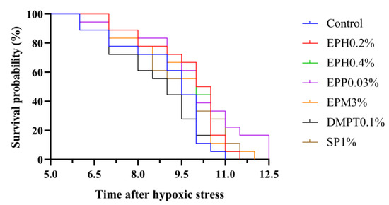 Survival analyses after hypoxia stress have been assessed using a Kaplan–Meier survival curve in Figure 3. Although there was no statistical difference, the log-rank test (p = 0.073) indicated that survival curves were to some extent affected by dietary treatments. For example, when the dissolved oxygen in the water was 0.6 mg/L at 6 h after hypoxic stress, shrimp in the control and DMPT0.01% groups began to die. Dead shrimp were observed in all the groups when hypoxic stress lasted for 7 h and the dissolved oxygen in the water was still 0.6 mg/L. At this time point (7 h), survival probability in shrimp fed bio-products of E. prolifera and squid paste groups was higher than 80%, but the control and DMPT0.01% groups reached 78% and 72%, respectively. Until 10 h of hypoxic stress, dissolved oxygen in water decreased to 0.3 mg/L, and survival probability of shrimp fed bio-products of E. prolifera was higher than that of the control, DMPT 0.01%, and SP1% groups. Finally, when dissolved oxygen in the water was 0.2 mg/L at 11.5 h of hypoxia stress, survival probability of the EPP0.03% and EPM3% were still 17% and 6%, respectively, while those of the other groups were 0. It indicated that after hypoxia stress, the average survival time of shrimp fed diets containing bio-products of E. prolifera was longer when compared to the control diet.