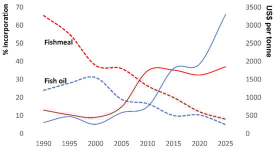 The most important operating variable during Atlantic salmon aquaculture, representing around 47% of the cost of production in major salmon-producing countries, is feed []. Traditionally, salmon feed has relied heavily on fishmeal (FM) and fish oil (FO) as major ingredients [,]. This is because FM has high nutrient density, is decidedly digestible and palatable, and has an outstanding profile of essential amino acids, vitamins, and minerals. Because salmon and other vertebrates lack the δ12 and δ15 desaturases needed to convert oleic acid (18:1 n-9) into linoleic (C18:2 ω-6) and α-linolenic (18:3 ω-3) acid, they are unable to synthesize essential omega-3 fatty acids (EFAs) such as eicosapentaenoic acid (EPA) and docosahexaenoic acid (DHA) de novo [,]. For these reasons, FO, an excellent source of EPA and DHA, became the gold standard provider for farmed salmon. However, over the last few decades, there has been a steady reduction in the use of FM/FO in salmon feeds (Figure 1), and this trend is likely to continue for a variety of reasons. First, catches from industrial fisheries, which embody the key raw material for aquafeeds (i.e., forage fish), have experienced declines and fluctuations due to overfishing, natural events (e.g., El-Niño Southern Oscillation events), and climate change-induced effects [,]. Second, a greater proportion of forage fishes are now being used directly as human food [,], and third, competition for FM and marine oils has increased from the animal feeds sector, supplement, functional food, cosmetic, and pharmaceutical industries [,,]. These factors have combined to raise the cost of FM and FO (Figure 1), and have spurred research into the use of alternative, more sustainable, and often cost-effective ingredients, which are now finding a more prominent place in marine carnivore feeds.
