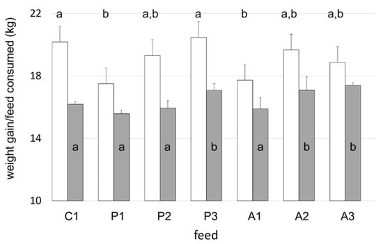 Increase in tank biomass (white) and feed intake (grey) of Atlantic salmon maintained on control, plant, and animal protein-based diets for 90 days. Different letters for same-colored bars indicate differences between treatments (p ≤ 0.04). Bars represent ±S.D.