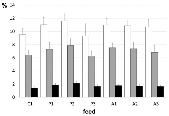 Viscerosomatic (white), enterosomatic (grey), and hepatosomatic (black) indices of Atlantic salmon maintained on control, plant, and animal protein-based diets for 90 days. No differences were discerned in measured values between dietary treatments. C = control, P = plant, and A = animal. All data are ±SD.