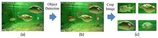 Data cropping: The images obtained during the data collection phase contained multiple fish while we required single fish images for our final training. Therefore, we needed to crop the data. The cropping method employed was a semi-automatic approach. Specifically, we utilized the YOLOv8 network [] to detect objects in the processed images. Figure 3b illustrates the detection results of YOLOv8, and then the detected fish were automatically cropped into individual images as shown in Figure 3c.