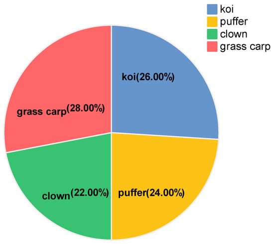 Data labeling: The cropped images were first collected and then resized to 224 × 224 pixels. We manually organized fish images with the same ID into corresponding folders, which were named 1 to 300 in sequential order. This process completed the construction of the WideFish dataset. The final dataset consists of 5000 fish images of different qualities, including 1300 koi images, 1200 puffer fish images, 1100 clown fish images, and 1400 grass carp images. The sample distribution of the dataset is shown in Figure 4. In order to facilitate training and testing, we divided the 5000 images into a training set and a testing set. The training set contains 4000 fish images and the test set contains 1000 fish images.