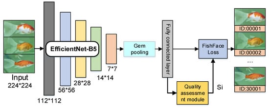 In order to solve the problem that low-quality images can bring interference to the training of recognition networks, this paper designed a fish individual recognition network framework (FishFace) with a quality evaluation module, as shown in Figure 5. The whole process is divided into 4 steps.