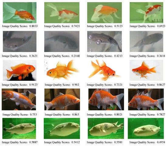 To address the aforementioned challenges, Wang proposed a novel method for the real-time individual recognition of swimming fish, which is based on an improved version of YOLOv5 []. This method utilizes a convolutional neural network with an embedded attention module to detect and recognize fish in underwater images. Petrellis [] proposed a shape alignment technique based on a regression tree ensemble machine learning method to solve the problem where fish are almost indistinguishable from the background in low-contrast underwater images. Khan [] presented the design of FishNet, an automated monitoring system capable of identifying, localizing, and predicting aquatic species and their functional traits; in addition, they open sourced a massively diverse dataset containing 94,532 well-organized images from 17,357 aquatic species. Similarly, Yin introduced LIFRNet, a lightweight backbone network designed specifically for fish visual feature extraction []. By incorporating deformable convolution and edge feature learning, LIFRNet adapts to different fish shapes and poses while enhancing feature discrimination. Additionally, Gao proposed FIRN, a new network dedicated to fish detection []. FIRN leverages an anchor-free approach and a feature pyramid network to improve accuracy and speed. While these methods demonstrate excellent performance in identifying individual fish under ideal conditions, they often overlook the challenges posed by real underwater environments, such as variations in lighting, blurring, and fish pose. Furthermore, there is currently no robust solution to mitigate the negative impact of low-quality fish data on model training results.