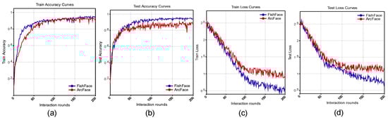 Comparison of the FishFace loss and ArcFace loss training processes (a–d).