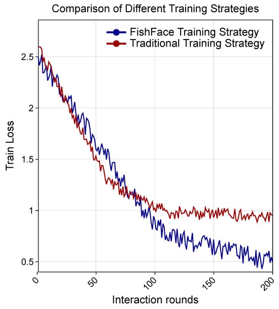 To verify the effectiveness of the step-by-step training method for the fish body recognition network proposed in this paper, we compared it with the traditional training method. Specifically, the step-by-step training method trains 90, 20, and 90 rounds for the respective three stages. The traditional training method is to train the whole model for 200 rounds. The comparison results are shown in Figure 10. The traditional training method reached a loss value of 1.15 at round 80 and then no longer decreased, while the step-by-step training method was able to reduce the loss value to 0.5. This experiment proves that the distributed training algorithm can better reduce the training loss value and improve the fish body recognition accuracy.