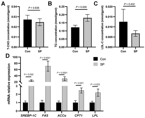 The liver is the hub of the lipid metabolism. We sought to explore changes in lipid metabolism in the liver to explain weight gain. The winter photoperiod significantly enhanced TG levels compared to the summer photoperiod (Con) (Figure 1B; p = 0.028). T-CHO and LDL-C levels did not change dramatically (Figure 1A,C). In addition, we measured gene expression to assess the effects of seasonal photoperiods on lipid metabolism. The winter photoperiod enhanced the transcript levels of the lipid synthesis-related genes sterol regulatory element binding protein-1C (SREBP-1C), fatty acid synthase (FAS), and acetyl CoA carboxylase alpha (ACCα), while the mRNA levels of fatty acid oxidation carnitine O-palmitoyltransferase 1 (CPT1) and the lipid hydrolysis-related gene lipoprotein lipase (LPL) were also significantly increased (Figure 1D; p < 0.05). The above results suggest that the winter photoperiod enhanced lipid metabolism to induce lipid accumulation, which may explain the increase in body weight.