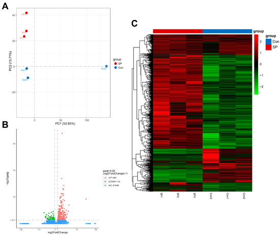 Preliminary analysis of transcriptome between SP and Con. (A) Principal component analysis (PCA) for the correlation among samples. (B) Volcano plots of DEGs. Green dots represent down-regulated expressed genes; red dots represent genes that are up-regulated; blue dots represent genes that are not differentially expressed. The abscissa represents the differential expression multiple; the ordinate represents the significance of the gene difference. (C) Hierarchical clustering of DEGs. Red indicates relatively high expression, and green indicates relatively low expression.