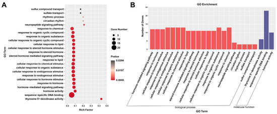 GO annotations analysis of the DEGs. (A) Scatter plot showed the GO Term among all DEGs detected in the liver of Huanghe carp with different photoperiods. The horizontal axis showed the rich factor and the vertical axis showed the GO term, respectively. The dot size presented the number of DEGs in each GO term. (B) Histogram diagram of GO enrichment analysis. The colors in the bar chart represent biological processes (BP) and molecular functions (MF), and the numbers of significant putative DEGs are shown on the x-axis.