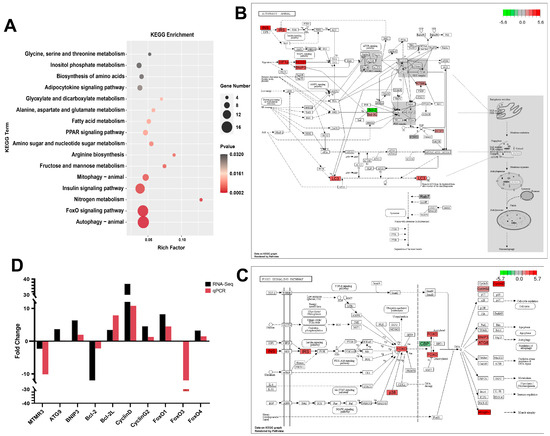 Significantly enriched KEGG pathways. (A) KEGG enrichment analysis scatter plot representing pathways of significant DEGs for seasonal photoperiodic changes in Huanghe carp. (B) Color pathway of the autophagy–animal. (C) Color pathway of the FOXO signaling pathway. The purple and red background color in the pathway represents the down-regulated and up-regulated genes, respectively. (D) Gene expressions of myotubularin-related protein 3 (MTMR3), autophagy-related protein 9 (ATG9), B-cell lymphoma-2 (BCL2), BCL2 interacting protein 3 (BNIP3), B-cell lymphoma-2 like 1 (BCL2L1) (also known as BCL-XL), CYCLIND, CYCLING2, forkhead box O1 (FOXO1), forkhead box O3 (FOXO3), and forkhead box O4 (FOXO4).