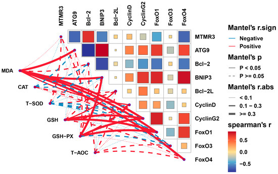 Pairwise comparisons of FOXO, autophagy, and cell cycle–related genes are shown, with a color gradient denoting the Spearman’s correlation coefficients. Mantel test was performed to analyze the correlation between antioxidant parameters and FOXO and autophagy-related genes. Edge width corresponds to Mantel’s r statistic for the corresponding distance correlations, and edge color denotes the statistical significance. The above programs were performed using R v4.1.1 (https://www.r-project.org (accessed on 10 September 2023)). p < 0.05 was the threshold of significance.