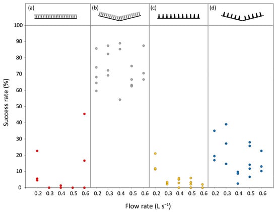 A strip plot showing the percentage of ascent attempts by eel in the 0.25 m–0.5 m pass section, which were successful, per trial. Trials were conducted with four different substrate/lateral slope combinations: (a) laterally flat bristle (red circles); (b) V-profile bristle (grey circles); (c) laterally flat studs (yellow circles); and (d) V-profile studs (blue circles). Trials were conducted under five different flow levels (0.2, 0.3, 0.4, 0.5 and 0.6 L s−1).