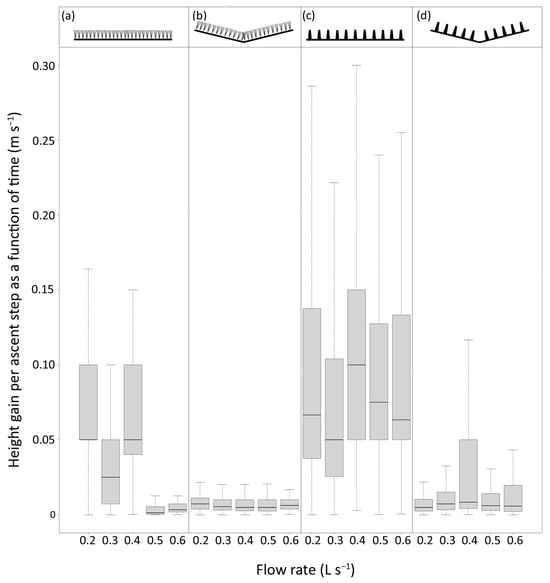 Boxplot of the height advanced up the pass per second, calculated for each step of eel tracks in the 0.25–0.5 m section of eel passes with four different substrate types and five different flow rates. Only steps where a gain in height was achieved are included. Thick line, median; boxes, interquartile ranges (Q1–Q3); whiskers, non-outlier range. (a) laterally flat bristle; (b) V-profile bristle; (c) laterally flat studs; and (d) V-profile studs.