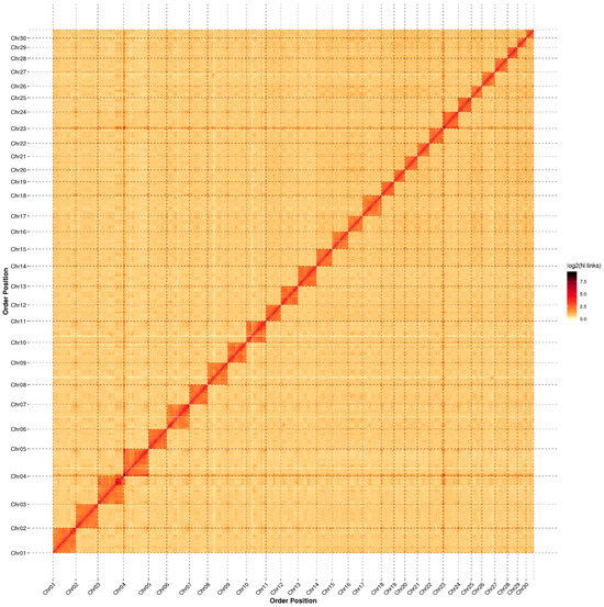 Hi-C sequencing was applied to obtain chromosome-level scaffolds, and approximately 156.35 Gb of clean data were obtained. After aligning the clean data to the genome, we identified 443,986,225 pairs of uniquely mapped Hi-C read pairs, of which 199,653,196 pairs represented valid Hi-C data, accounting for 44.97% of the uniquely mapped reads. After Hi-C correction and assembly, we ultimately obtained 30 chromosome-level scaffolds constructed from 373 contigs with a total length of 794.43 Mb (98.56% of the total length of all contigs) (Table 1). Among the sequences mapped to the chromosomes, 778.20 Mb could be assigned to specific positions and orientations. The contig N50 was 16.10 Mb, and the scaffold N50 was 29.14 Mb. The genome circular plot (Figure 1) displayed gene density, repetitive sequence density, GC content, and collinearity. The Hi-C assembly chromosome interaction heatmap (Figure 2) demonstrated a strong interaction intensity between adjacent sequences, confirming the effectiveness of the genome assembly.