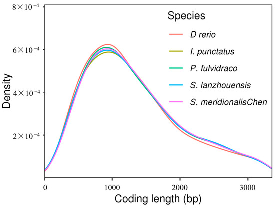 The S. lanzhouensis genome was annotated using homology-based prediction, de novo prediction, and transcriptome prediction, resulting in 23,093 protein-coding genes. Among these genes, 22,814 (98.79%) were predicted by at least two different methods, indicating high-quality predictions. With an average of 10.33 exons per gene, the average gene length was 17,150.79 bp and the average CDS length was 1756.34 bp. The number of genes in the S. lanzhouensis genome are comparable to P. fulvidraco (23,790), higher than S. meridionalis Chen (22,294) and I. punctatus (22,872), but lower than D. rerio (30,994). Furthermore, we assessed the quality of gene predictions by comparing the length distribution of the coding sequences (CDS) with that of closely related species (Figure 3), confirming the reliability of our gene predictions.