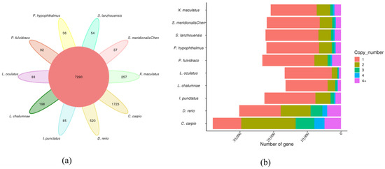 Analysis of gene families of various species. (a) Gene family clustering petal map; (b) copy number distribution of all gene families in each species.