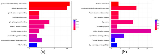 A comparative analysis of single-copy gene families among S. lanzhouensis, I. punctatus, P. hypophthalmus, P. fulvidraco, and S. meridionalis Chen identified genes under significant positive selection, which were further subjected to GO and KEGG enrichment analysis (Figure 8). The GO enrichment analysis demonstrated that the positively selected genes in S. lanzhouensis were primarily enriched in molecular functions related to growth factor receptor binding and cytokine receptor binding. The KEGG enrichment analysis further revealed that the positively selected genes were predominantly associated with pathways such as thiamine metabolism, protein processing in the endoplasmic reticulum, and protein digestion and absorption.