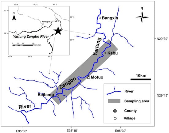 Sampling sites (29.17°–29.59° N, 94.98–95.37° E) were located at Motuo County, where the Yarlung Zangbo River breaks through YZGC and flows across the southern part of Tibet (Figure 1). The features of rivers and streams in this area include lotic flow and high gradient. The area experiences humid and warm air currents from the Indian Ocean’s southeast Bay of Bengal, which penetrates the Tibetan Plateau and the Himalayas. Thus, the investigated sites possess a humid climate, with a yearly air temperature of 16 °C and precipitation above 2200 mm/a. The predominant substrate components are cobbles and boulders, with little gravel and sand [].
