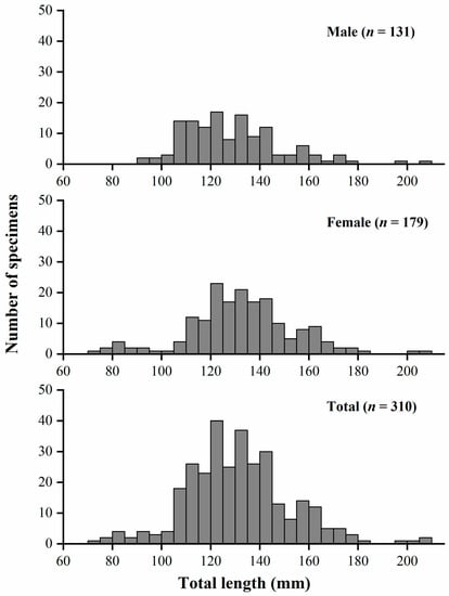 Samples ranged from 72–207 mm TL while TW ranged from 2.5–60.0 g. Males (n = 131) ranged from 91 to 205 mm TL while females (n = 179) ranged from 72 to 207 mm TL. Length frequency distributions were significantly different between males and females (Kolmogorov–Smirnov Z = 1.341, p < 0.05). The modal length intervals were the 120–140 mm TL group, which included 41% of all specimens (Figure 3).