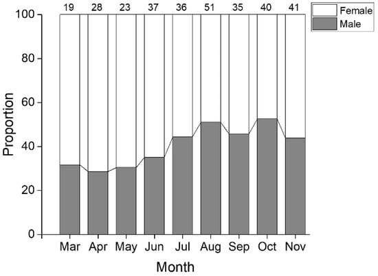 The male-to-female ratio was 0.73:1, revealing a markedly different value from the anticipated 1:1 (χ2 = 7.432, p < 0.05). Between March and June, the proportion of females was much higher than that of males, whereas the proportion of males and females was balanced between August and November (Figure 4).