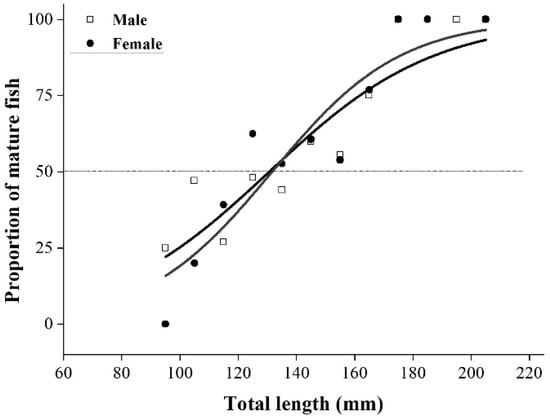 Only a slight gender disparity was noted in length at first maturity (Figure 5). The logistical model computed the TL50 values as 131 mm in males and 132 mm in females and resulted in the following logistic equations: P = (1 + e−0.035(TLmid–130.7))−1 (n = 131, R2 = 0.831) in males and P = (1 + e−0.046(TLmid–131.7))−1 (n = 179, R2 = 0.856) in females.