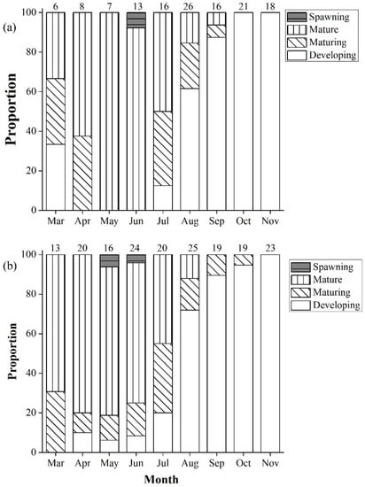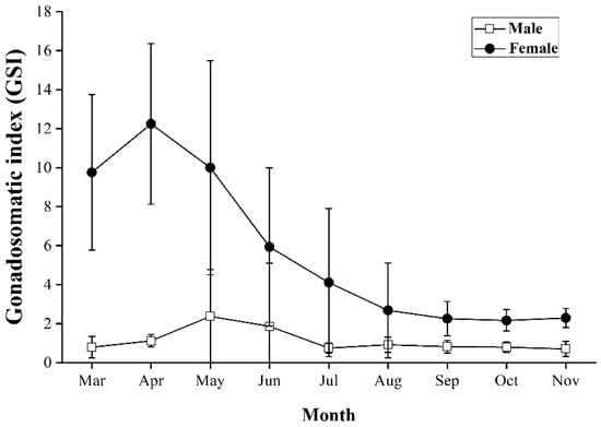The spawning season of P. sulcatus was assessed by comprehensive analysis and judgment of monthly variations in macroscopic maturity phases, gonadosomatic index (GSI), and oocyte size–frequency distributions. The GSI of the mature fish was computed as follows [,]: