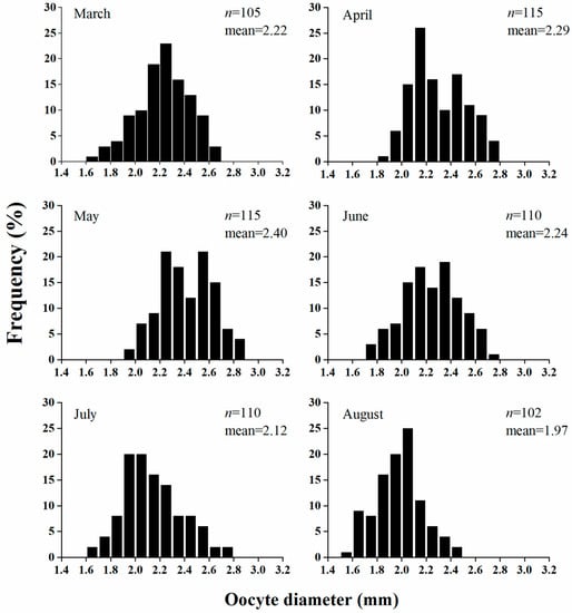 We subsampled the ovaries of P. sulcatus from 34 mature female adults in total from March to August and preserved them in formalin (7%) to assess the monthly distribution of oocyte size. The diameter of the egg was estimated by capturing the egg images with a Nikon SMZ 745T, with a precision of 0.001 mm in Image Pro Plus 6.0. ANOVA and subsequent Tukey’s post hoc test were used to examine significant inter-month GSI differences [,].
