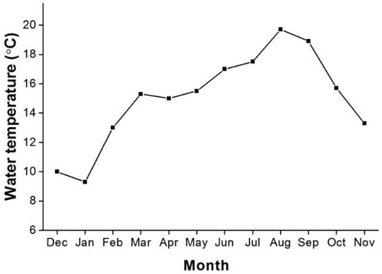 Monthly variation in water temperature at Motuo, the lower reaches of the Yarlung Zangbo River between December 2015 and November 2016.