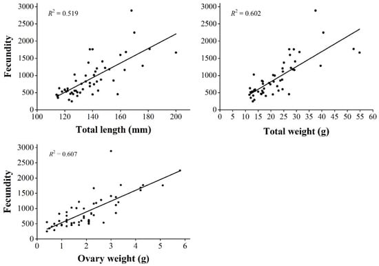 The absolute fecundity of P. sulcatus showed a linear relationship with its total length and weight along with its ovary weight, which is displayed in Figure 10. The regression equations were fitted as shown below:
