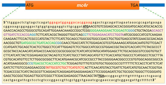 Electroporated fish showed a 285 bp on-target deletion in addition to substitution mutations that were not at the target sites but were still within the coding sequence. The 285 bp deletion began 14 bp upstream of the start codon and continued for 271 bp in the 5′ end of the coding sequence. The deletion of the 5′ untranslated leader and the start codon from mRNA should reduce ribosome binding strength and translational efficiency [], and if translated, 90 amino acid residues would be missing from the protein’s N-terminal end in addition to a frameshift mutation. All these consequences of the deletion would likely inhibit MC4R function. Unlike electroporation, which gave only one type of deletion, microinjected fish had several forms of on-target mutations ranging from insertion/deletion of a few base pairs to 693 bp deletion. Deletion or insertion of nucleotides that are not multiples of three is expected to switch the reading frame and change the entire protein. The MC4RA sgRNA resulted in six types of mutations, including 4, 8, 13, 18, and 22 bp deletions and a 14-bp insertion. The 18 bp deletion is expected to eliminate 6 amino acid residues from the protein without changing the frame for translation, while all other mutations should result in a frameshift and a premature stop codon. MC4RB induced two deletions (6 and 10 bp) and 9 bp insertion. A deletion of 516 bp was generated by MC4RC sgRNA in addition to 4 and 12 bp insertions. Eleven mutations were identified in the MC4RMIX group which was simultaneously injected with the three sgRNAs. These mutations included insertions, deletions, or a combination of both. About 82% of these mutations (9 of 11) are expected to shift the reading frame. The other two mutations—the deletions of 264 and 693 bp—would not change the reading frame but are expected to eliminate 88 and 231 amino acid residues from the protein. Compared with the wild type, the patterns and lengths of bands revealed with gel electrophoresis differed depending on the treatment group of the mutated fry. The mutated samples of the MC4RMIX group showed the highest variability in banding patterns revealed by gel electrophoresis. Similarly, the alignment of MC4RMIX group sequences revealed the most variable types of mutation. This may be attributed to the co-injection of the three sgRNAs resulting in several possibilities of double strand break and repair. In several sequencing clones from the MC4RMIX group, the region between two or three sgRNAs was eliminated. This result aligns with those of previous reports of inducing large deletions in channel catfish using multiple sgRNAs simultaneously [].