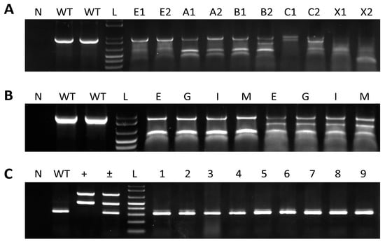 - Qiu, P.; Shandilya, H.; D’Alessio, J.M.; O’Connor, K.; Durocher, J.; Gerard, G.F. Mutation detection using Surveyor™ nuclease. Biotechniques 2004, 36, 702–707. [Google Scholar] [CrossRef]