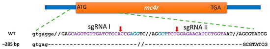 CRISPR-Cas9-induced mutations in channel catfish, Ictalurus punctatus, mc4r gene via the co-electroporation of the Cas9 plasmid and two sgRNAs plasmids. The wild-type (WT) channel catfish mc4r gene sequence is shown on the top. Sequences in purple and blue colors are the target sites of the sgRNA and protospacer-adjacent motif (PAM), respectively. Uppercase and lowercase letters indicate the coding and non-coding sequences, respectively. Red arrows indicate the expected sites of cleavage by Cas9. Dashes represent the deletion of nucleotides along the mc4r gene.