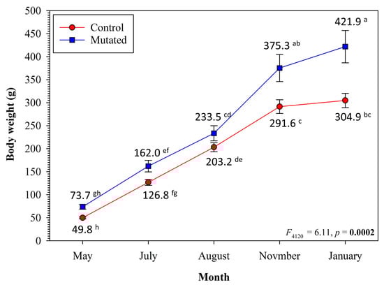 Growth of melanocortin-4 receptor (mc4r) mutated Kansas random channel catfish, Ictalurus punctatus, compared with the full-sib control fish. The fish were grown in 60 L glass aquaria in a recirculating system at a density of eight fish per aquarium and two replicates per group. All of the fish were fed ad libitum on a 32% crude protein diet. Means are shown for each sampling time-point, where with different superscript letters indicate significant difference (Two-way month and treatment analysis of variance test with interaction).