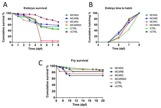 The embryos started to hatch at 6 dpf and all embryo hatching was completed at 8 dpf (Figure 5B). The embryo mean time to hatch ranged from 6.9 to 7.4 dpf (Table 3). The overall comparison of embryo mean time to hatch revealed significant differences among at least two groups (p = 0.001). Multiple comparisons detected significant differences between the iCTRL group and all of the other groups except MC4RC (p < 0.005). All of the other comparisons were not significant (p > 0.05).