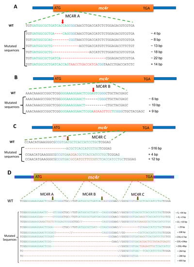 The PCR amplicons from mutated individuals were cloned and sequenced to identify the nature of mutations in each treatment. The nucleic acid alignment of the mutated sequences against the wild-type sequence revealed multiple forms of insertions/deletions caused by the CRISPR/Cas9 system at target sites (Figure 6). The mutated individuals from the MC4RA group showed five types of deletions of 4, 8, 13, 18, and 22 base pairs and only one insertion of 14 base pairs (Figure 6A). In the MC4RB group, only two types of deletions (6 and 10 bp) and one insertion (9 bp) were observed (Figure 6B). The MC4RC group had two types of insertions (4 and 12 bp) and one large deletion (516 bp, Figure 6C). In the 516 bp deletion, approximately half of the exon of the channel catfish mc4r gene was removed. The MC4RMIX group exhibited multiple forms of deletions/insertions, including several large deletions of up to 693 bases (Figure 6D).