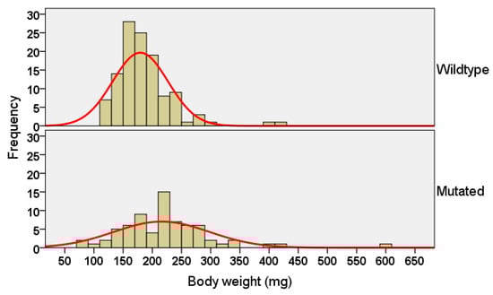 The distribution of body weights of mc4r-mutated fry was shifted towards higher values (Figure 7). The mutated fry exhibited significantly higher body weights (215.8 ± 9.6 mg, n = 72) compared with the control fry (179.4 ± 4.4 mg, n = 117; p = 0.001), which was about a 20% increase in body weight. The comparison of body weight was performed with and without the inclusion of an outlier mutant fry (body weight = 590 mg), but no changes to the significance of the results were detected. No significant differences in body length were detected between the mutated and control fry (p = 0.467).