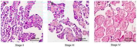 A total number of 20 two-year-old female S. argus (weight: 242.83 ± 50.90 g, length: 19.48 ± 1.13 cm) were collected from Donghai Island in Zhanjiang, Guangdong Province, China. The fish fasted for 24 h and then were anaesthetized with MS-222 (Sigma, St. Louis, MO, USA) before sampling. Then the fish were dissected for ovarian and pituitary tissues. Then liquid nitrogen was used to snap freeze the pituitary and ovary that were then stored at −80 °C, ready for RNA extraction. Part of the ovaries was fixed in Bouin’s solution overnight. The fixed ovaries were then used for preparing paraffin sections and stained with hematoxylin-eosin according to the manipulation of Jiang et al. []. The stained fragments were observed under a Nikon Eclipse Ti-E microscope (Tokyo, Japan). The development stages of the ovary were determined according to previous findings [,].