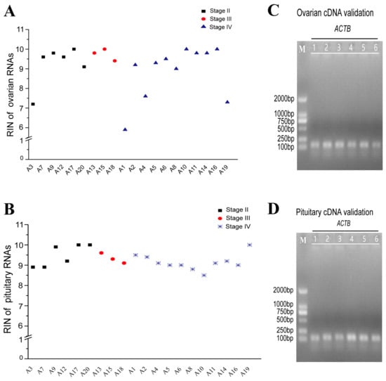Quality detection of total RNA and cDNA. RIN of ovarian (A) and pituitary (B) RNAs (RIN above 7 indicates high RNA integrity). Amplification of ovarian (C) and pituitary (D) cDNA by ACTB.