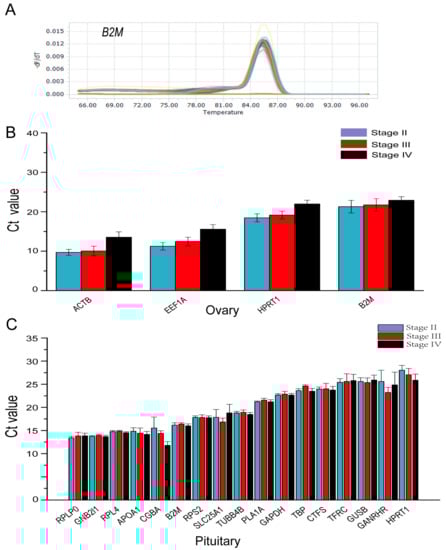 RT-qPCR revealed that the candidate reference genes’ mean Ct values varied from 9.52 to 21.95 cycles in the ovary and 13.42 to 28.03 cycles in the pituitary (Figure 3A,B). In both the ovary and pituitary tissues, the candidate reference genes expression varied with the ovary development.