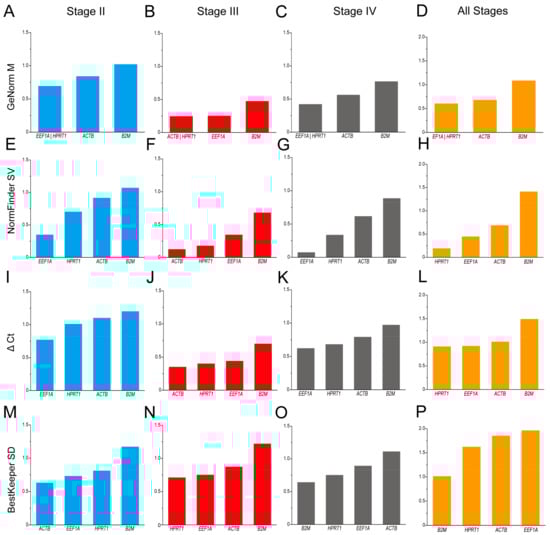 Analysis of the candidate reference gene stability in ovaries at different stages based on GeNorm (A–D), NormFinder (E–H), ΔCt (I–L), and BestKeeper (M–P) programs.