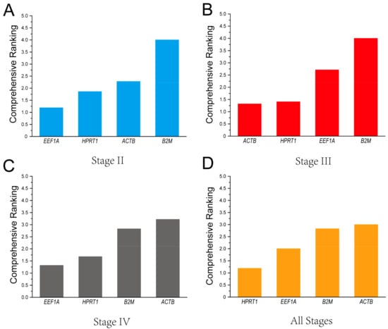 Based on the four methods above, the potential gene stability was comprehensively ranked throughout all stages using RefFinder. The results indicate that the ranking of stability was EEF1A > HPRT1 > ACTB > B2M in ovaries at stage II (Figure 5A), ACTB > HPRT1 > EEF1A > B2M in ovaries at stage III (Figure 5B), EEF1A > HPRT1 > B2M > ACTB in ovaries at stage IV (Figure 5C), and finally, HPRT1 > EEF1A > B2M > ACTB in ovaries at all stages (Figure 5D).