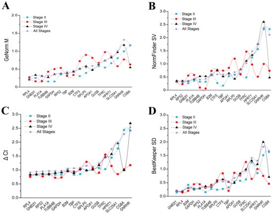 Ranking of the candidate reference genes’ stability in ovaries at different stages using RefFinder. (A) Stage II; (B) Stage III; (C) Stage IV; (D) All stages.