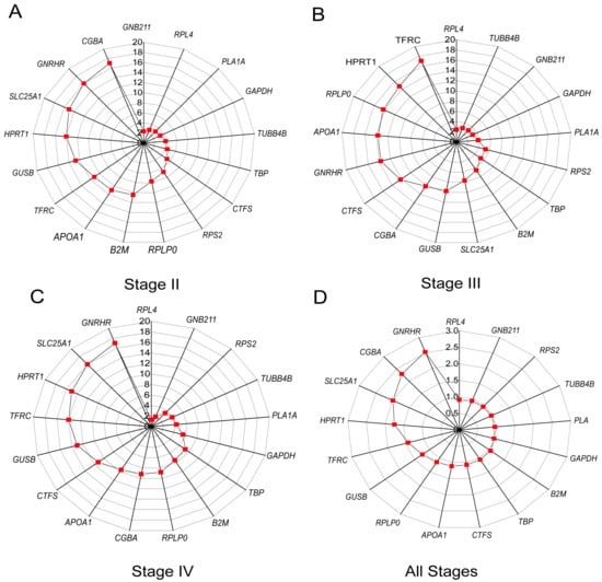 In the pituitary, NormFinder, ΔCt, BestKeeper, and GeNorm analyses revealed that RPL4, GNB2L1, PLA1A, TUBB4B, GAPDH, RPS2, TBP, and B2M were more stable than other candidate reference genes because their stability ranking was always in the forefront, although their stability ranking order was different in samples of different stages (Figure 6A–D). In the GeNorm analysis, GAPDH and TUBB4B were more stable reference genes in the pituitary at stage II, GNB2L1 and PLA1A in the pituitary at stage III, RPL4 and TUBB4B in the pituitary at stage IV, and RPL4 and GNB2L1 in the pituitary at all stages (Figure 6A). In the BestKeeper analysis, the results show that SLC25A1, GNRHR, and CGBA in the pituitary at stage II; HPRT1 and TFRC in the pituitary at stage III; HPRT1, SLC25A1, and GNRHR in the pituitary at stage IV; and SLC25A1, HPRT1, GNRHR, and CGBA in the pituitary at all stages were not stable for SD > 1 (Figure 6C).