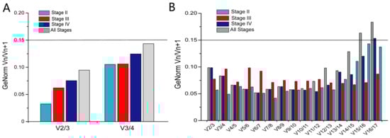 The GeNorm analysis showed that the V2/3 was below 0.15 across the different developmental stages in the ovary and pituitary tissues, respectively. The two reference genes were reliable for the accurate normalization of gene expression; therefore, there is no need to introduce the next internal reference gene for correction (Figure 8). Combined with the analysis of the reference gene stability, EEF1A and HPRT1 and RPL4 and GNB2L1 can be used to combine optimal reference genes in the ovary and pituitary, respectively, at stage II, stage IV, and for all stages. In stage III, the combination of optimal reference genes was ACTB and HPRT1, and RPL4 and TUBB4B in the ovary and pituitary, respectively.