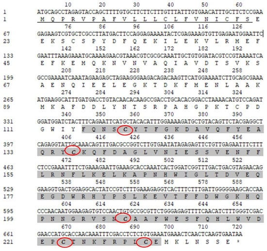Deduced amino acid sequences and complete nucleotides of Rpcl. The underline is SP, the gray shading is CRD, and the C circled in red is the conserved cysteine.