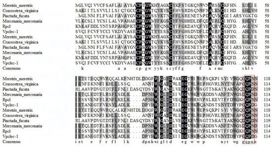 Multiple alignment of amino acid sequences of CTL, Rpcl, and other mollusk lectins. Black parts are 100% similar amino acids, and the gray parts are 75% similar ones. Conserved structures (QPN) are indicated by red boxes. The GenBank accession numbers of proteins are listed: Crassostrea virginica (XP_022328732.1), Mercenaria (XP_045180913.1), Meretrix meretrix (ANS83633.1), Pinctada fucata (ACO36046.1), Rpcl (AZS54112.1), and vpclec-1 (AZS54109.1).
