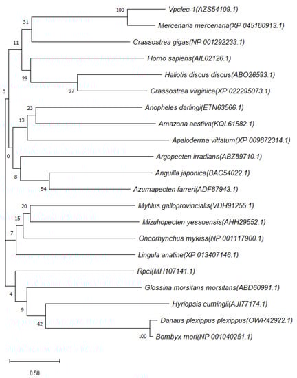 Phylogenetic analysis of Rpcl and other CTLs. MEGA X was utilized to implement evolutionary analyses, and Neighbor-Joining method was applied to infer the evolutionary history. In the bootstrap test, the percentage of replicate trees where relevant taxa were clustered together (1000 replications) was indicated close to branches. We drew the tree to scale, and the units of branch length are identical to those of the evolutionary distances utilized for inferring phylogenetic trees. The Poisson correction method was performed to calculate the evolutionary distances in units of amino acid substitutions per site.