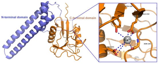 The structure of Rpcl predicted by RosettaFold: the N- and C-terminal domains are indicated and differently colored. The Ca2+-binding site is enlarged and shown in the right panel.