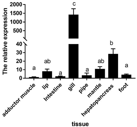 The distribution of Rpcl in various tissues of R. philippinarum using qRT-PCR. Different letters represent significant differences. Three biological replicates for each tissue sample, and the data are described by mean ± SD (n = 6). Tukey HSD multiple comparisons and one-way ANOVA were carried out for analysis of statistically significant differences. Diverse letters denote significant differences, and p < 0.05.