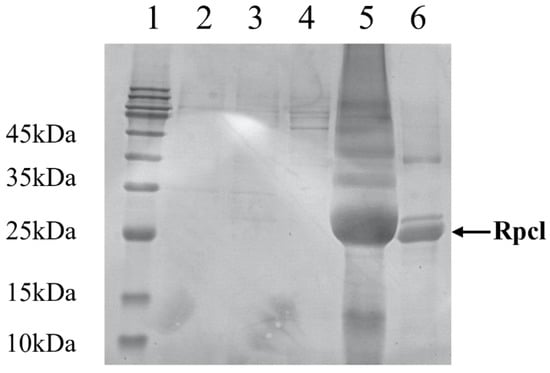 The recombinant proteins were expressed as inclusion bodies. SDS-PAGE acquired distinct bands from the precipitated ultrasonic fragmentation solution with a molecular weight of approximately 27.94 kDa. This is the Rpcl target protein band (Figure 6). Lane 1 is the protein molecule standard, lane 2 is the induced pET-28a, lane 3 is the negative control (Rpcl), lane 4 is the induced Rpcl (supernatant), lane 5 is the induced Rpcl (inclusion bodies), and lane 6 is the purified protein.